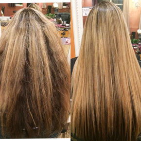 This treatment is an add-on blow dry treatment that must be ironed into the hair & can last up to five shampoos. Touch of Keratin leaves the hair 100% frizz free, shiny, & decompressed. Wait 24 hours before shampooing, to allow the product to cure.